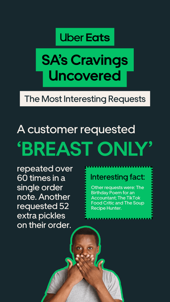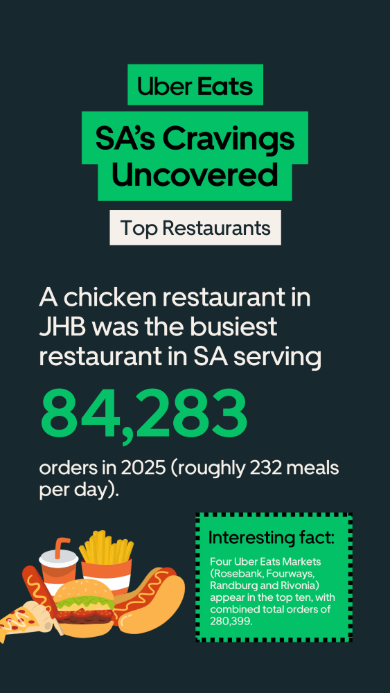 “Our annual Cravings Report shows just how vibrant, diverse and proudly South African our food culture is. Whether it’s late-night orders, high-value treats, heartfelt request notes or the fastest deliveries in the country, people are embracing convenience with personality. We’re excited to keep delivering moments of joy – from everyday meals to unforgettable surprises.” ~ Ntsoaki Nsibanyoni Uber Eats General Manager for Sub Saharan Africa