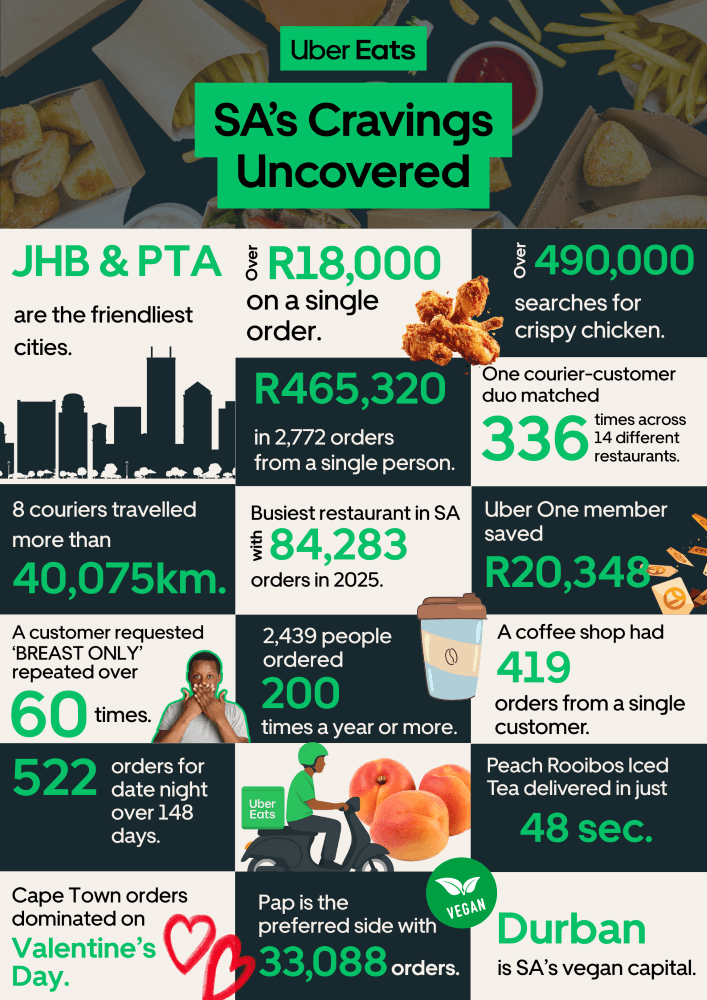 Inside Uber Eats South Africa 2025 Cravings Report – South Africans did not simply order this year. They curated, choreographed and customised. Left notes that read like diary entries. They elevated fried chicken to a national treasure, and turned the comments box into a place for romance, precision, and the occasional stern reminder written entirely in capital letters.
