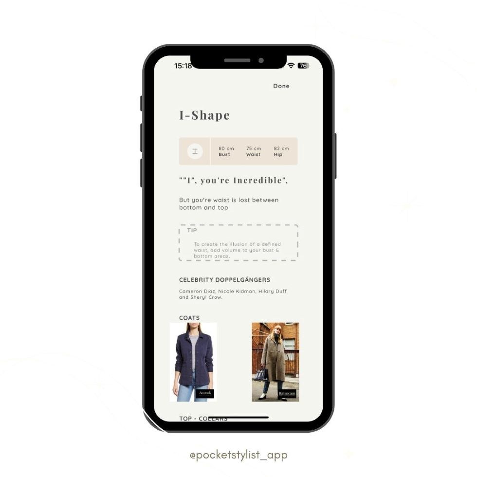 Whether in-person or virtual consultation, input client measurements for instant access to results on body shape, face attributes, and more. The app conveniently covers Horizontal and Vertical Body Shapes, Colour Analysis, Style Personality, Face Shape, makeup, and beyond in the comfort of your own phone.