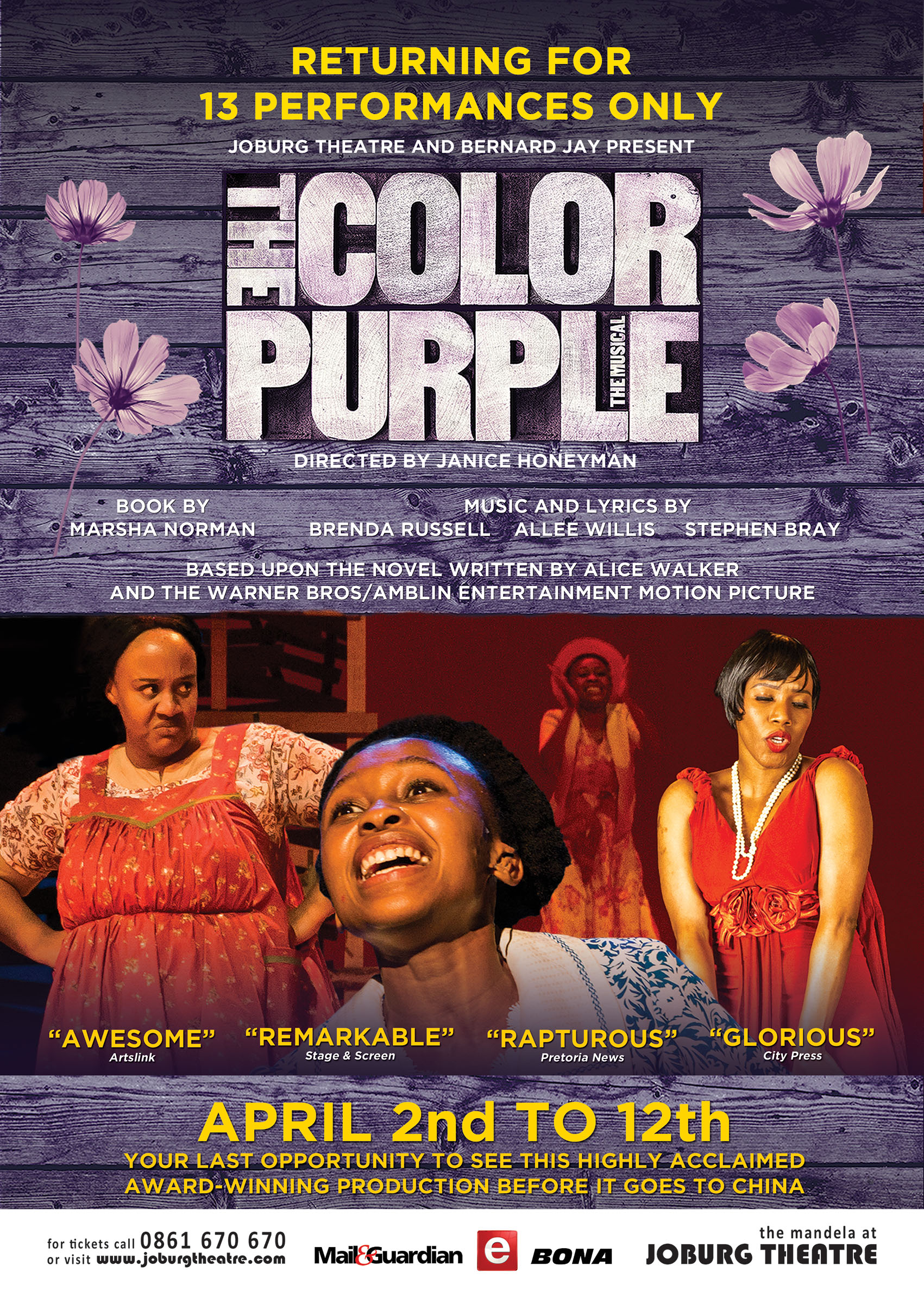 The Color Purple continues for its third season at Joburg Theatre from April 2nd to 12th this year. Tickets can be purchased at www.joburgtheatre.com or by calling 0861 670 670.
