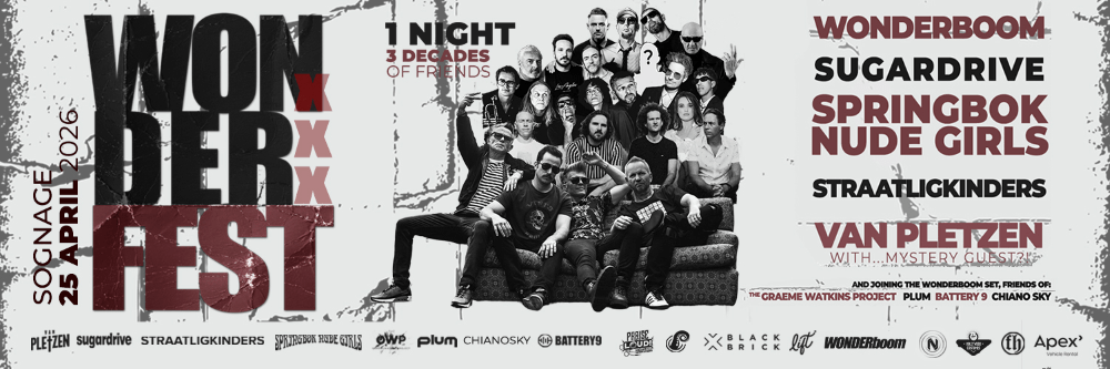 Joining WONDERboom on stage are the Springbok Nude Girls, Sugardrive, Straatligkinders and Van Pletzen (with a mystery guest).