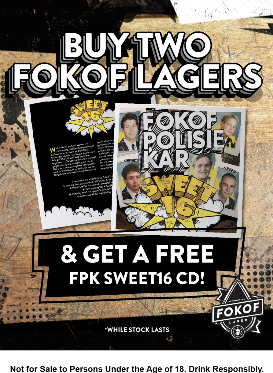 Keep an eye on Fokof Lager’s socials to see where this promotion is run. Why two Fokof Lagers for one Sweet 16 CD? Because friends don’t let friends drink alone!