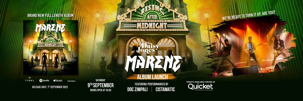 Witness the spectacle that is MARENE live at The Daisy Jones Bar on Saturday 9 September in celebration of the launch of ‘Rising After Midnight’. MARENE will be supported by special guests Doc Zimpali and Cistamatic. Rejoice in amazing drinks and food as MARENE rocks the night away into the crisp Stellenbosch!